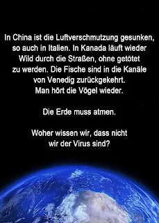 Wie kommt es denn, dass sich, seit die chinesische Industrie im letzten Dezember durch Corona lahmgelegt ist, ausgerechnet die Luftqualität dort wieder deutlich verbessert hat? Wegen Corona ist das Wasser in Venedig komischerweise wieder klar und es schwimmen sogar Delphine durch den Canale Grande. Es ist doch überaus erstaunlich, dass sich unser blauer Planet so schnell erholt, wenn wir ihn gezwungenermaßen mal nicht malträtieren können. Man erinnere sich nur an den letztjährigen Einsatz der jungen Schwedin Greta Thunberg. Beschimpft, gehasst und verhöhnt hat man sie. "F**K GRETA" klebte an Tausenden von Heckschürzen knapp über röhrenden Sportauspuffendrohren. NICHTS haben diese Fahrer kapiert! GARNICHTS!
