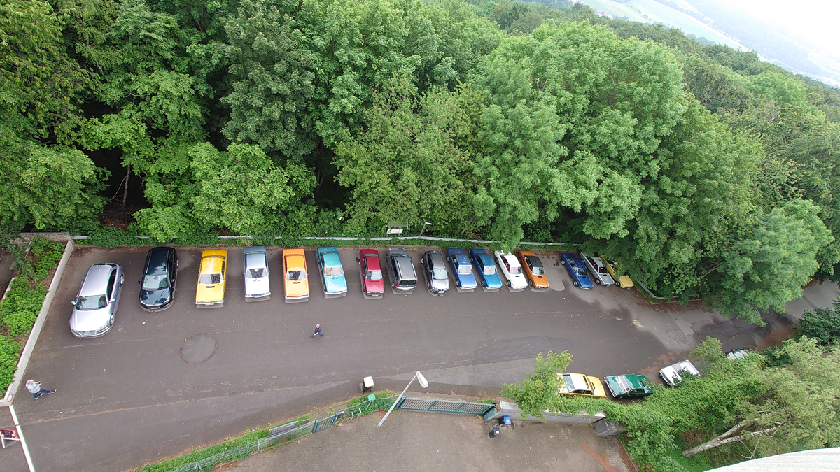 Gegen 14.00 Uhr war die K 70-Gruppe beim Fernsehturm Jakobsberg in Porta Westfalica angemeldet. Fleißig erklommen die Besucher dann auch die 23 Meter hohe Aussichtsplattform und erfreuten sich der Fernsicht und des Blickes auf ihre bunten Autos von oben. Im Biergarten unterhalb des Turms wurde bei angeregten Gesprächen Kaffee und Kuchen oder Bratwurst und Bier vertilgt. Leider begann es jedoch bald zu regnen. |