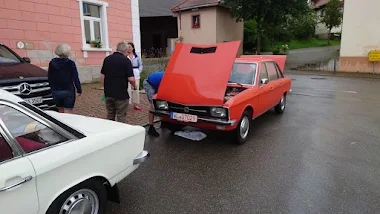 Am Samstagmorgen sind wir etwas gerädert, denn die ganze Nacht hat der Regen auf unser Autodach geprasselt. Dennoch treffen wir pünktlich am vereinbarten "Landhotel & Restaurant Tanne" in Fischingen ein. Natürlich unschwer zu erkennen an vielen VW K 70. Im gleichen Moment verlässt ein roter K 70 den Parkplatz hinter dem Restaurant. Zunächst ist an dieser Situation nichts auffällig. Doch im nächsten Moment erkennen die Teilnehmer dieses Treffens, dass auf dem Platz, an dem der rote K 70 eben noch stand, jetzt sehr viel schwarzes Öl in Richtung eines nahen Gullis fliesst. Beim nächsten Blick ist auch auf der regennassen Straße zu erkennen, dass sich hier Öl befindet. |